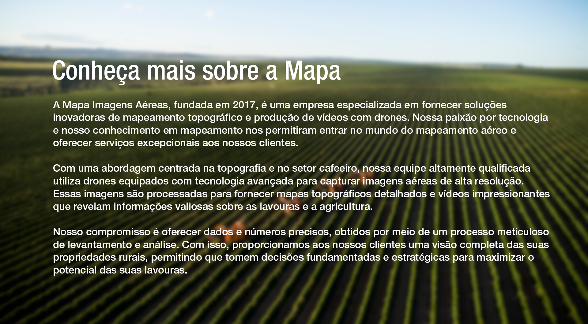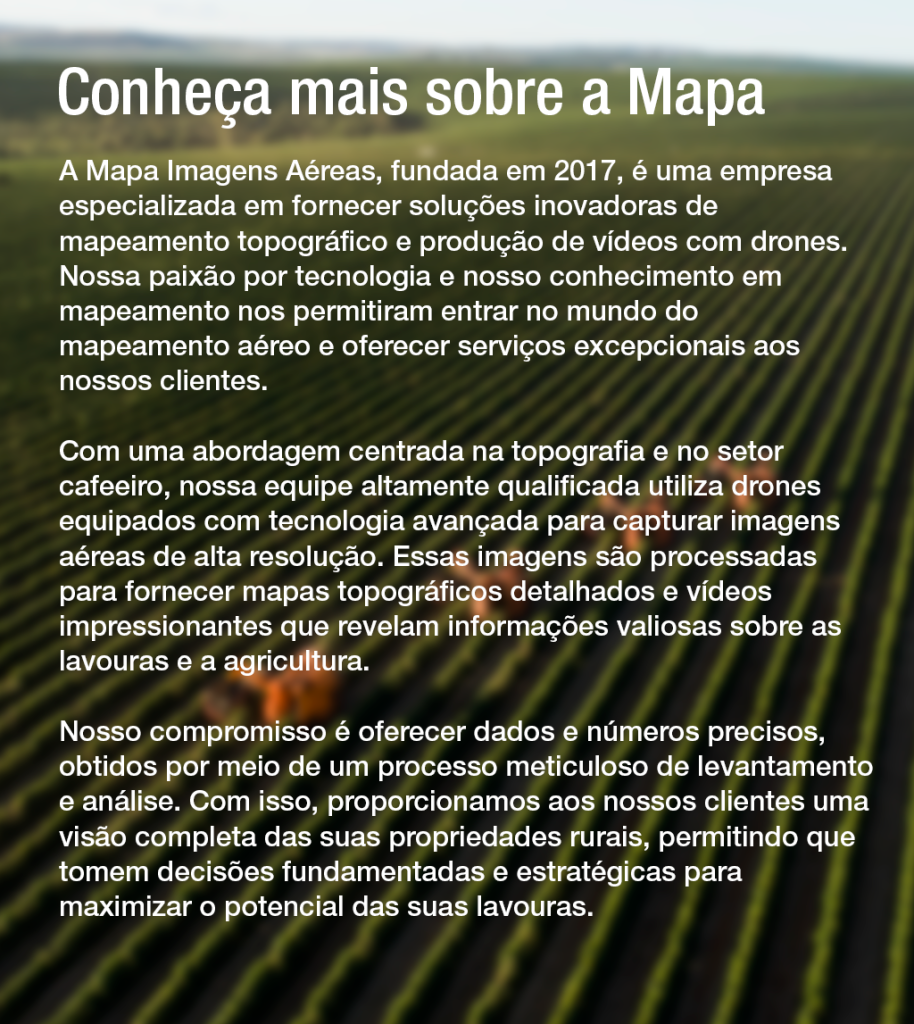 A Mapa Imagens Aéreas surgiu com objetivo de usar tecnologia de ponta para soluções em mapeamento e agricultura de precisão, buscando o melhor custo beneficio para o cliente.